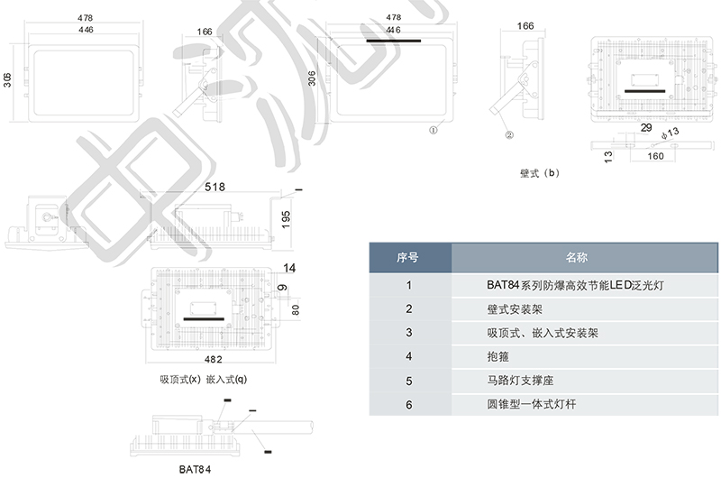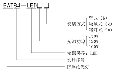 > ?按照產(chǎn)品型號(hào)規(guī)格說(shuō)明逐條選擇并注明防爆標(biāo)志,例如:需要防爆 LED 泛光燈 100W 規(guī)格,則產(chǎn)品型號(hào)為 BAT84-LED100;