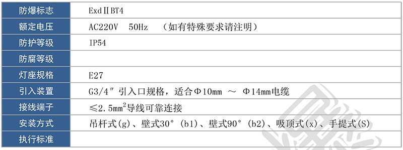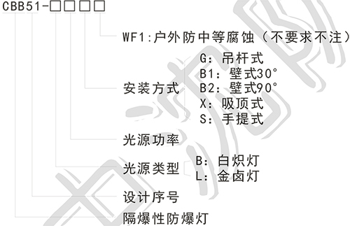 >?按照產(chǎn)品型號規(guī)格說明逐條選擇并注明防爆標(biāo)志,例如:需要金鹵燈 70W,吸頂式安裝則產(chǎn)品選型為:CBB51-L70X ExdⅡBT4;