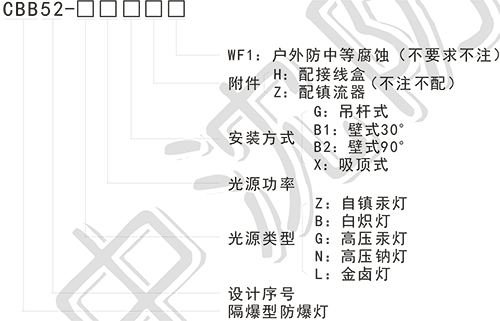 > 按照產(chǎn)品型號(hào)規(guī)格說明逐條選擇并注明防爆標(biāo)志,例如:需要金鹵燈 100W,吸頂式安裝則產(chǎn)品選型為:CBB52-L100X ExdⅡBT4;