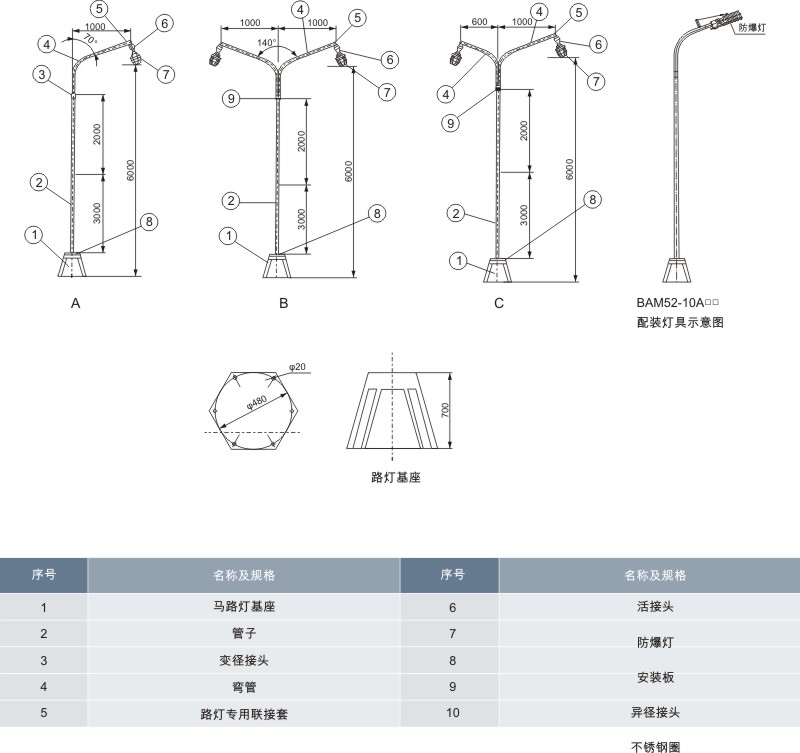 * 馬路燈由防爆燈、燈桿、基座三部分組成,基座內裝接線箱或路燈專用鎮流器。